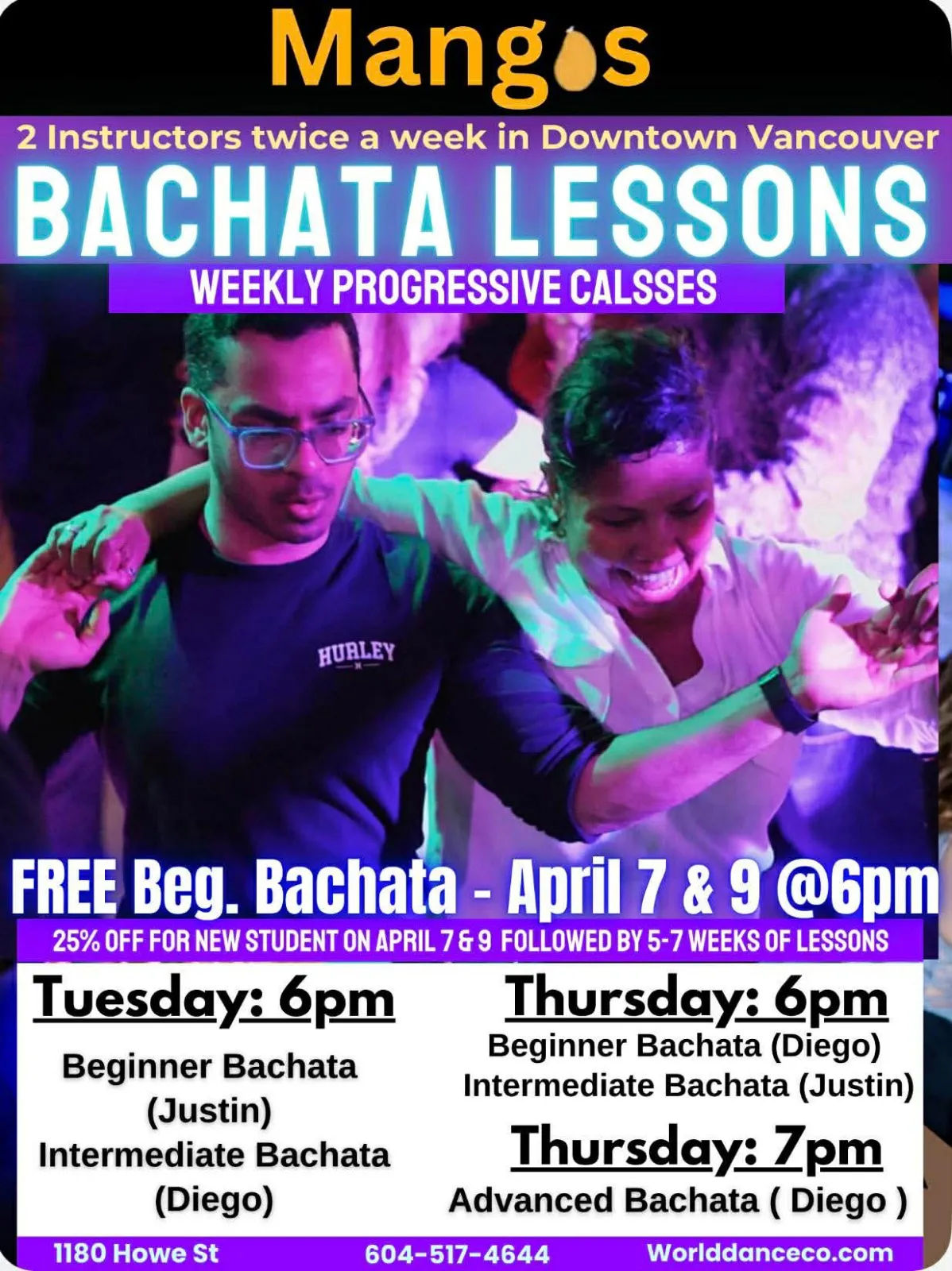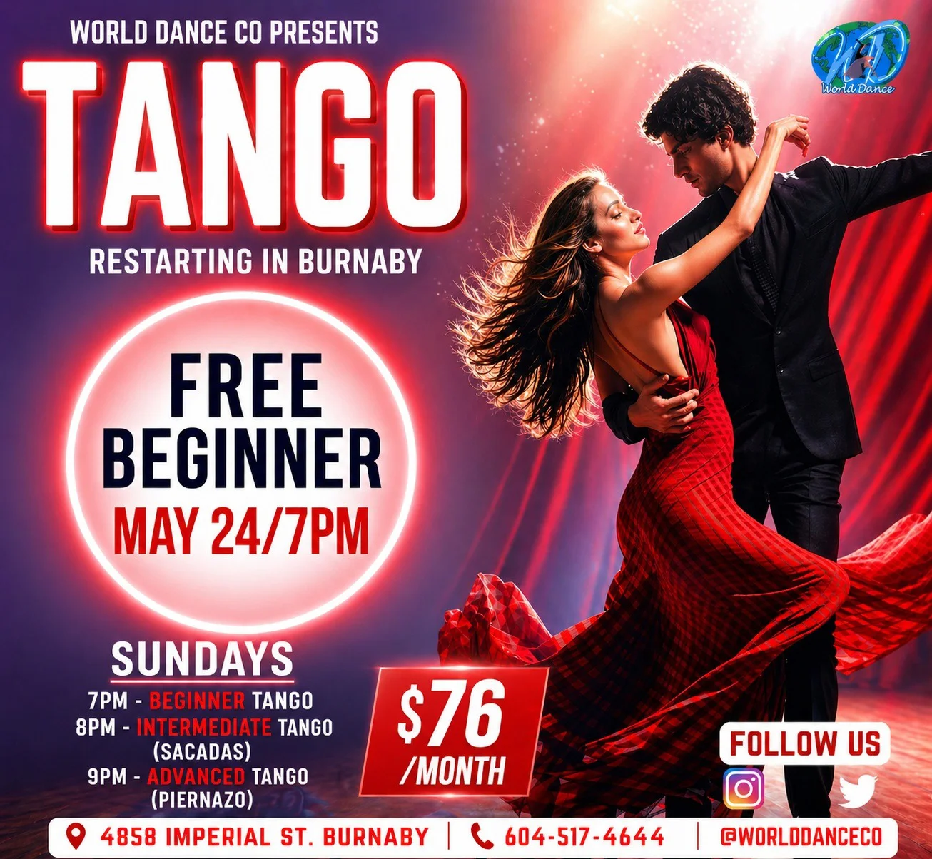 World Dance is the most complete Latin dance studio in Vancouver and Burnaby, offering all sorts of dance classes such as Salsa, Bachata, Tango, Ballroom, Latin, Standard, Mambo, Cumbia, Hip Hop, Jazz, Musical Theatre, Bellydance, Bollywood, Merengue and more!!!